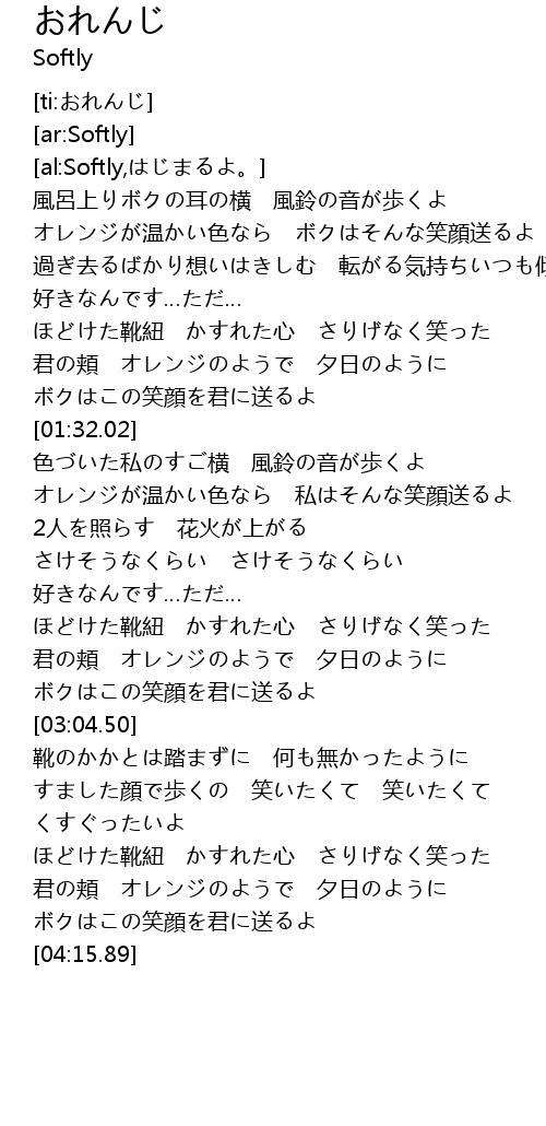 | [01:13.26] | 君の頬 オレンジのようで 夕日のように |