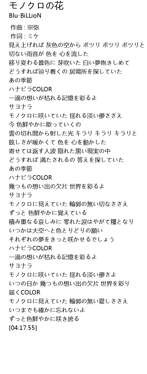 | [03:37.93] | モノクロに咲いていた 揺れる淡い儚さよ |
