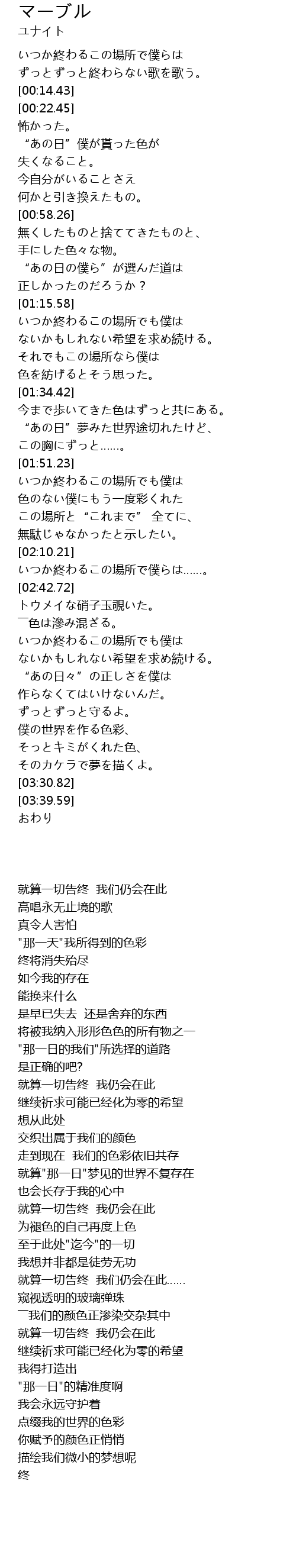 | [02:36.67] | いつか終わるこの場所で僕らは……。 |