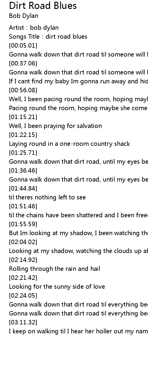| [03:08.42] | Gonna walk down that dirt road til everything becomes the same |