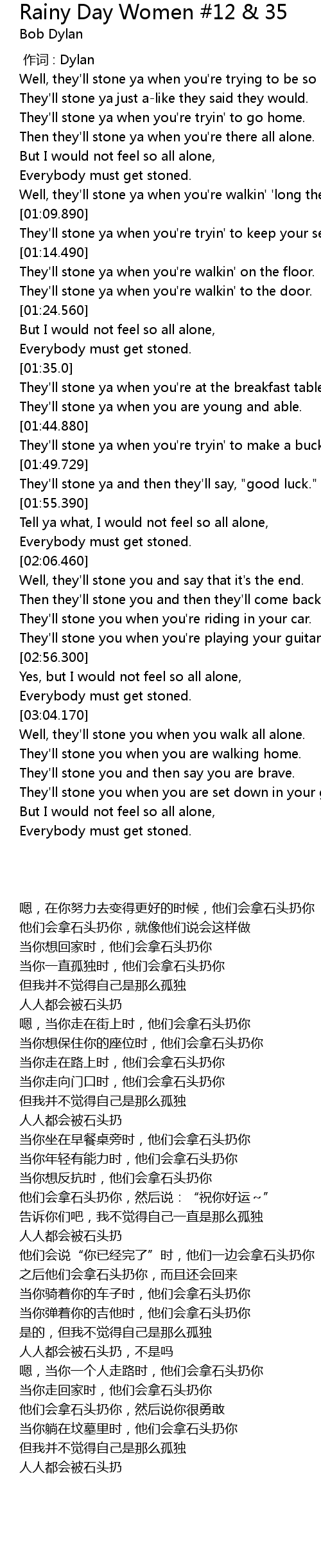 | [00:50.300] | Then they' ll stone ya when you' re there all alone. |