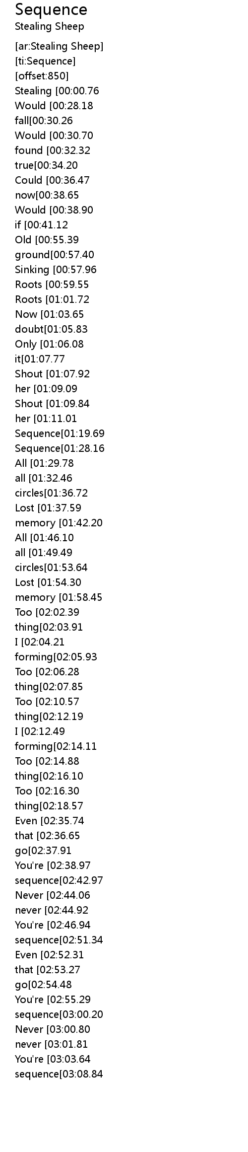 | [00:00.61]Stealing [00:00.76]Sheep [00:00.91]- [00:01.07]Sequence[00:01.47] |