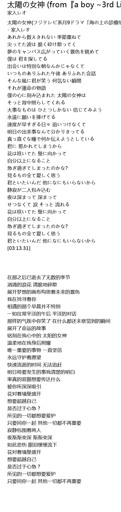 | [00:00.40] | 太陽の女神(フジテレビ系月9ドラマ「海の上の診療所」主題歌) - 家入レオ |