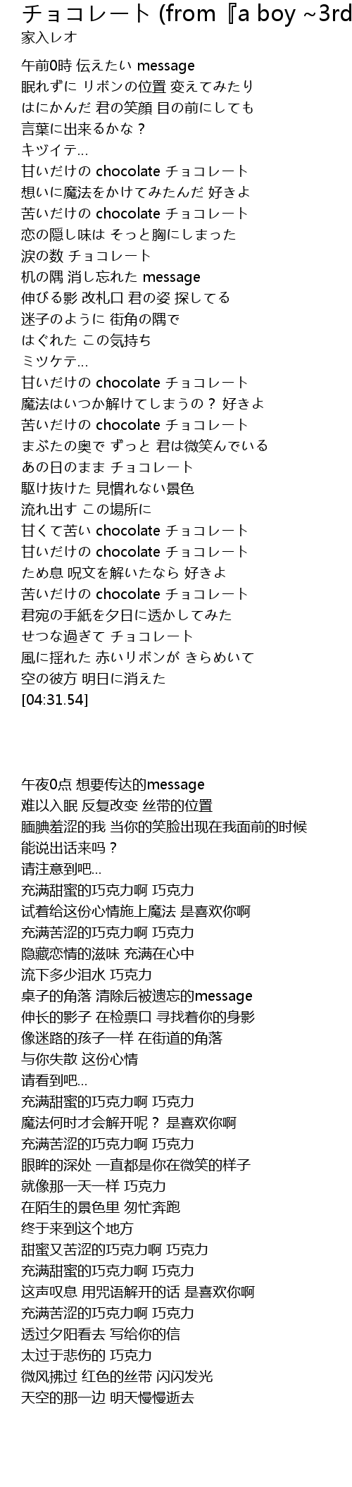 | [03:25.57] | 甘くて苦い chocolate チョコレート |