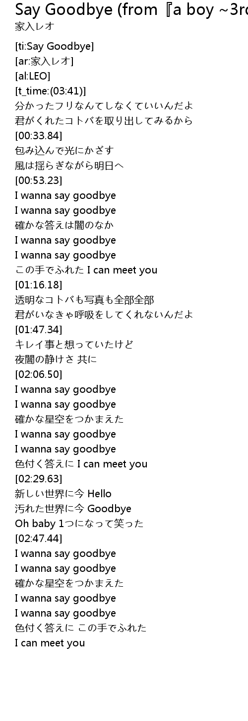 | [02:35.66] | wū shì jiè jīn Goodbye |