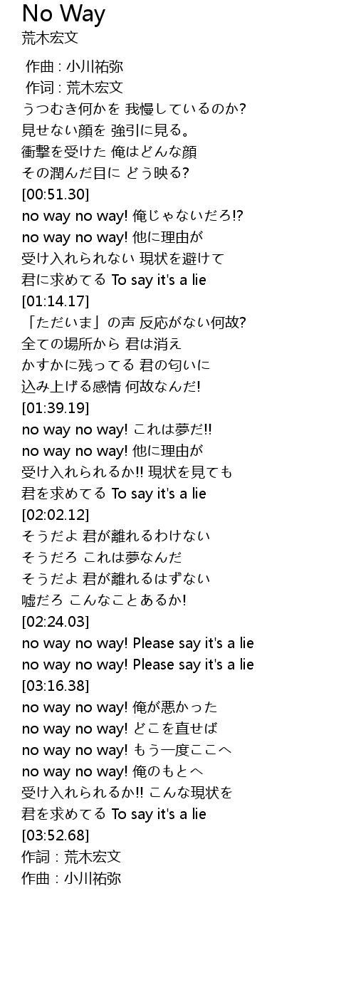 | [00:51.69] | no way no way! 俺じゃないだろ!? |