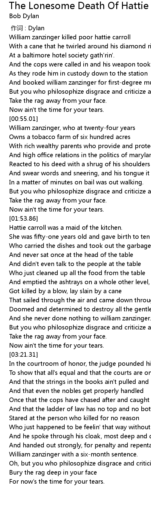 | [00:00.95] | William zanzinger killed poor hattie carroll |