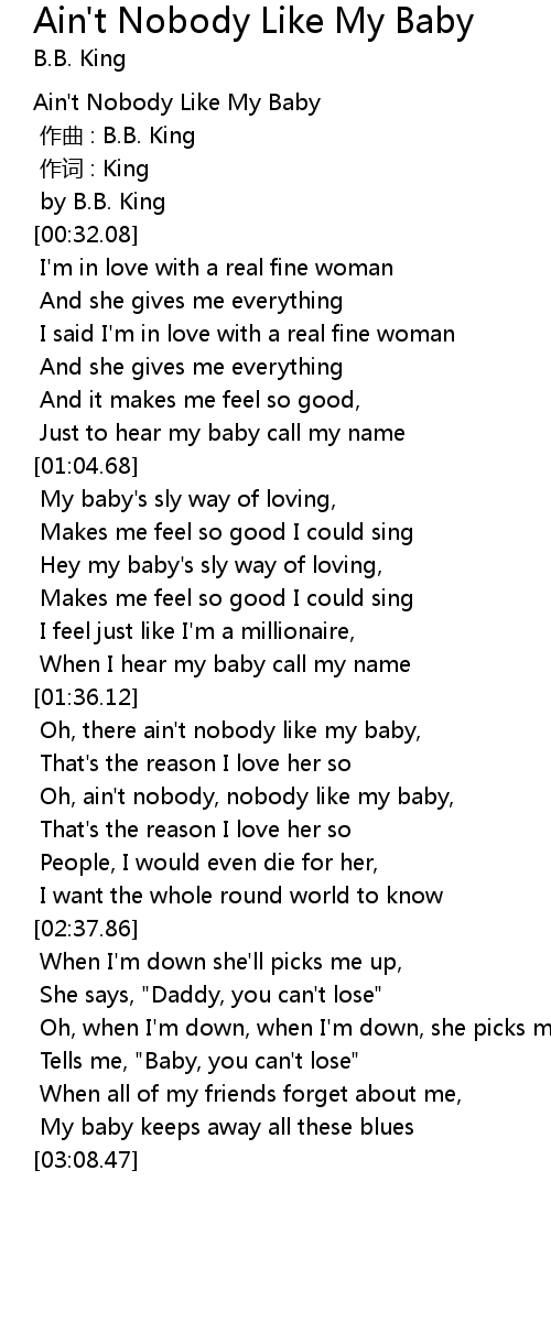 | [02:18.14] | Oh, ain't nobody, nobody like my baby, |