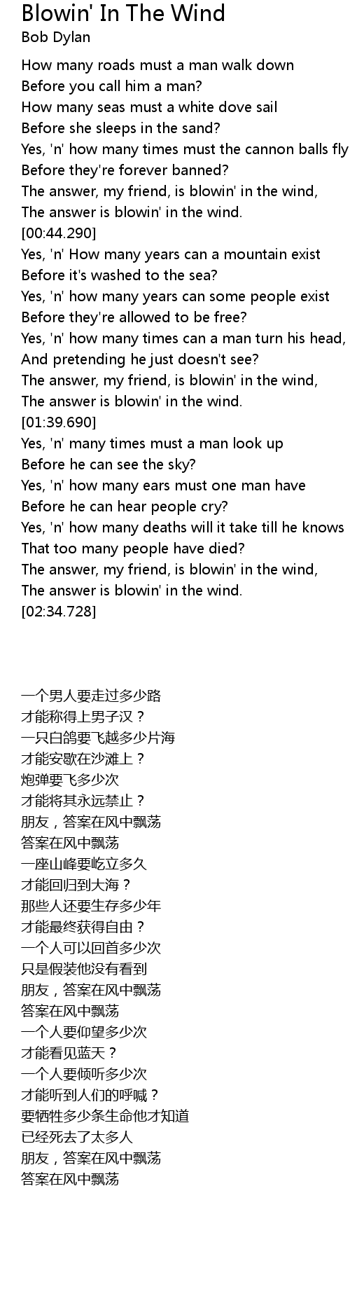 | [00:34.999] | The answer, my friend, is blowin' in the wind, |