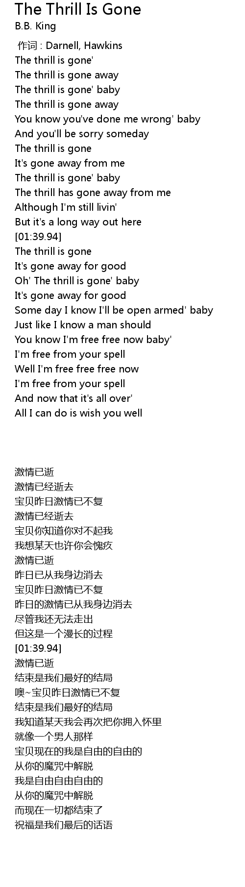 | [02:20.48] | Oh' The thrill is gone' baby |