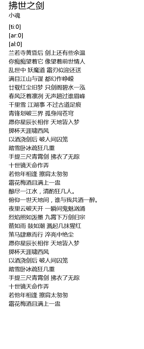 | [01:22.500] | 以酒浇剑后 破人间囚笼 |