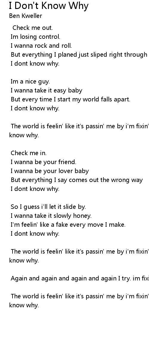 The world is feelin' like it's passin' me by i'm fixin' to lose it but I dont know why. |