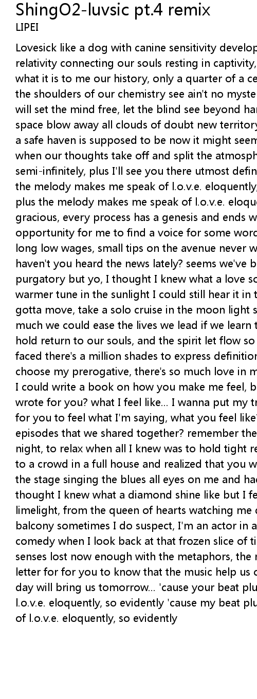 Lovesick like a dog with canine sensitivity developing this new theory of relativity connecting our souls resting in captivity, positive life sacrifice what it is to me our history, only a quarter of a century reality, sitting on the shoulders of our chemistry see ain't no mystery, the colours that we mix will set the mind free, let the blind see beyond harmony! breathe life into dead space blow away all clouds of doubt new territory we determine to be everything a safe haven is supposed to be now it might seem distant but the time is near when our thoughts take off and split the atmosphere pure sound waves travel semi-infinitely, plus I'll see you there utmost definitely! 'cause the beat plus the melody makes me speak of l.o.v.e. eloquently, so evidently 'cause the beat plus the melody makes me speak of l.o.v.e. eloquently, so evidently good gracious, every process has a genesis and ends with a revelation god bless this opportunity for me to find a voice for some words that have waited for way too long low wages, small tips on the avenue never wasted, all hits for a revenue haven't you heard the news lately? seems we've been living for sometimes in a purgatory but yo, I thought I knew what a love song sound like but I felt a warmer tune in the sunlight I could still hear it in the room past midnite, gotta move, take a solo cruise in the moon light sometimes I do forget , oh how much we could ease the lives we lead if we learn to let go, the reins that we hold return to our souls, and the spirit let flow so you see, upon everyday faced there's a million shades to express definition of grace but the method I choose my prerogative, there's so much love in me I got to give! (chorus) oh how I could write a book on how you make me feel, but how about this song that I wrote for you? what I feel like... I wanna put my trust in these simple words for you to feel what I'm saying, what you feel like? reminisce about the little episodes that we shared together? remember the time that you told me in the cold night, to relax when all I knew was to hold tight remember the time that I spoke to a crowd in a full house and realized that you was my ace? I was the joker on the stage singing the blues all eyes on me and had nothing to prove but yo, I thought I knew what a diamond shine like but I felt a sharper love in the limelight, from the queen of hearts watching me quietly in the upper deck balcony sometimes I do suspect, I'm an actor in a well-scripted live divine comedy when I look back at that frozen slice of time and try to defrost the senses lost now enough with the metaphors, the motivation that I wrote this letter for for you to know that the music help us carry on, like you say a new day will bring us tomorrow... 'cause your beat plus my melody makes me speak of l.o.v.e. eloquently, so evidently 'cause my beat plus your melody makes me speak of l.o.v.e. eloquently, so evidently |