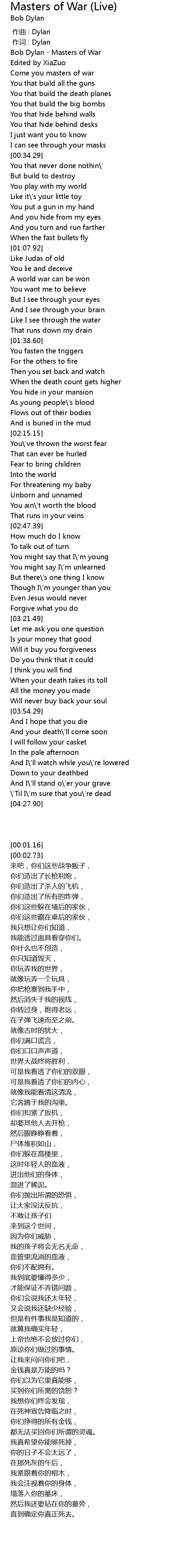 | [00:01.16] | Bob Dylan - Masters of War |