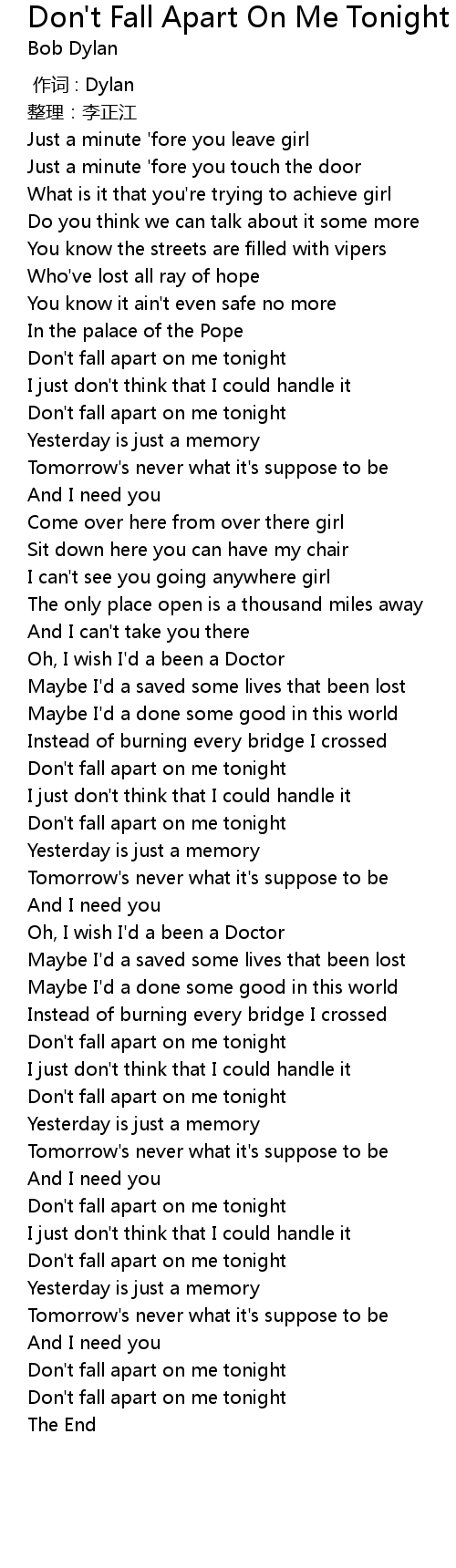 | [00:46.34] | Don' t fall apart on me tonight |