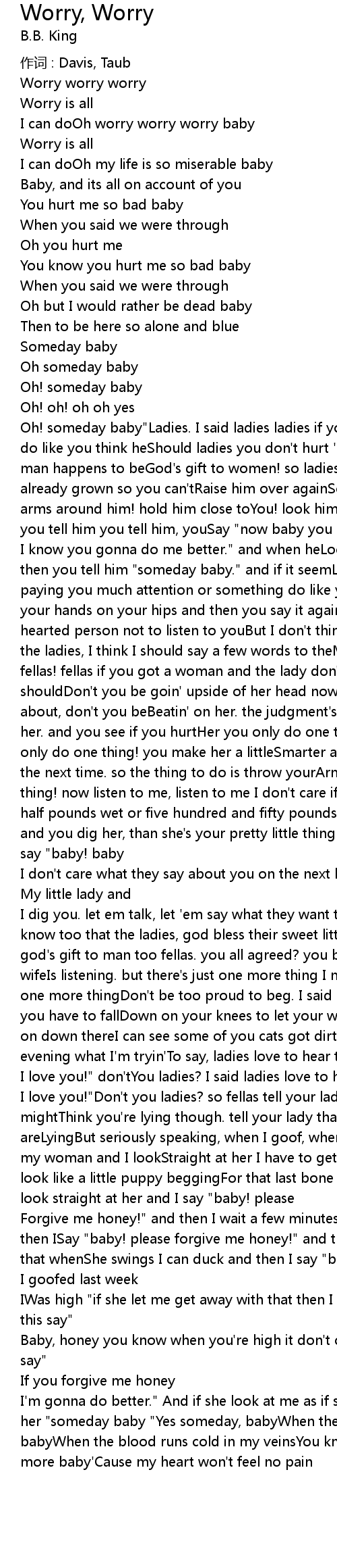 | I know you gonna do me better." and when heLook at you as if he wanna know when, then you tell him "someday baby." and if it seemLike he's hard of hearing or not paying you much attention or something do like you ladiesAre known to do put your hands on your hips and then you say it again ow! he have toBe a mighty hard hearted person not to listen to youBut I don't think it's fair to just talk to the ladies, I think I should say a few words to theMen too. so fellas I said fellas! fellas if you got a woman and the lady don't do likeYou think she shouldDon't you be goin' upside of her head now. you know what I'm talkin' about, don't you beBeatin' on her. the judgment's much cheaper if you don't beat her. and you see if you hurtHer you only do one thing I said if you hurt her you only do one thing! you make her a littleSmarter and she won't let you catch her the next time. so the thing to do is throw yourArms around the pretty little thing! now listen to me, listen to me I don't care if sheWeigh thirty-two and a half pounds wet or five hundred and fifty pounds on her feet. if she'sYour lady and you dig her, than she's your pretty little thing and then you tellHer! you say "baby! baby | |