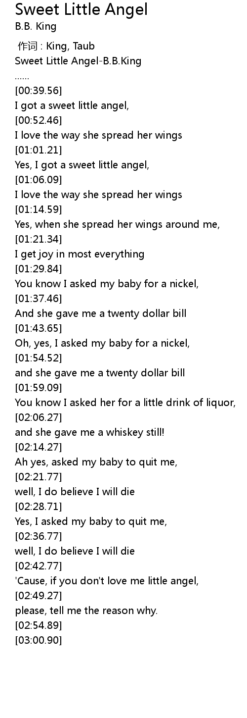 | [00:01.21] | Sweet Little AngelB. B. King |
