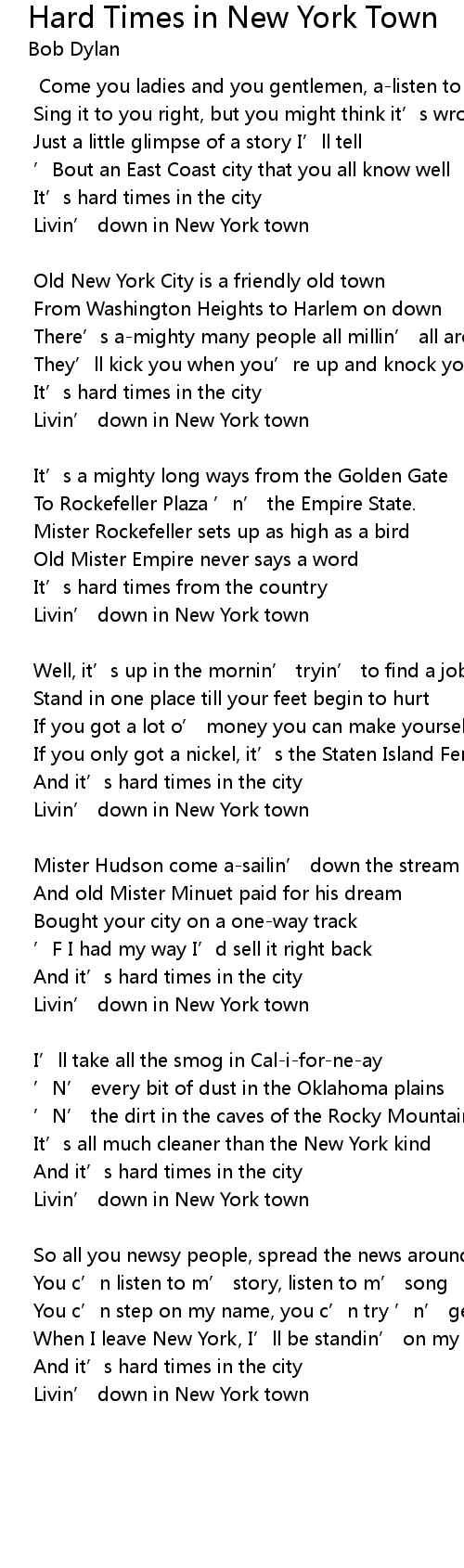| Well, it' s up in the mornin' tryin' to find a job of work | |