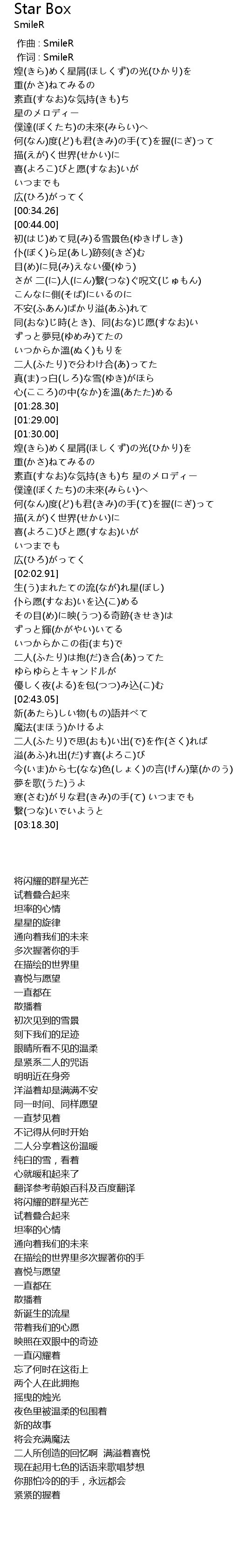 | [01:37.38] | 素直(すなお)な気持(きも)ち 星のメロディー |