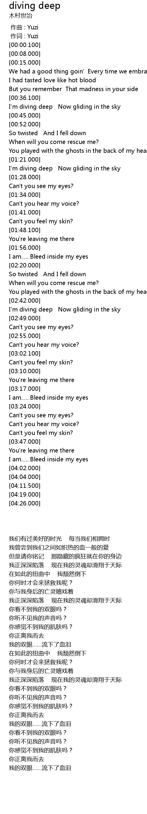 | [00:38.000] | I' m diving deep Now gliding in the sky |