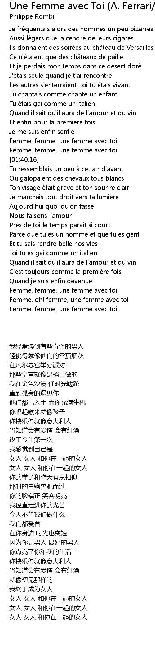| [01:23.24] | Femme, femme, une femme avec toi |