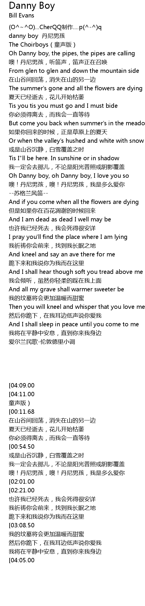 | Oh Danny boy, oh Danny boy, I love you so 噢!丹尼男孩,噢!丹尼男孩,我是多么爱你 | |