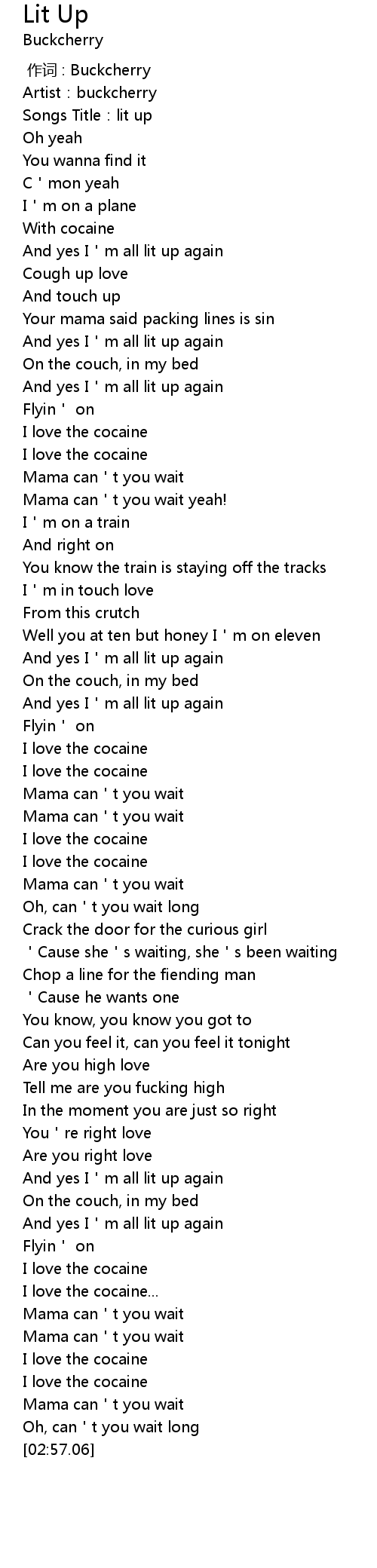| [02:45.95] | I love the cocaine |