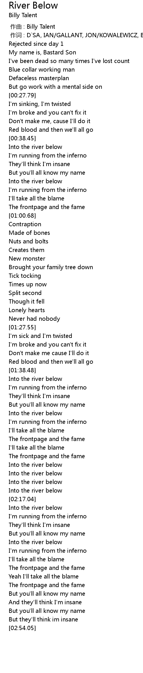 | [01:49.22] | Into the river below |