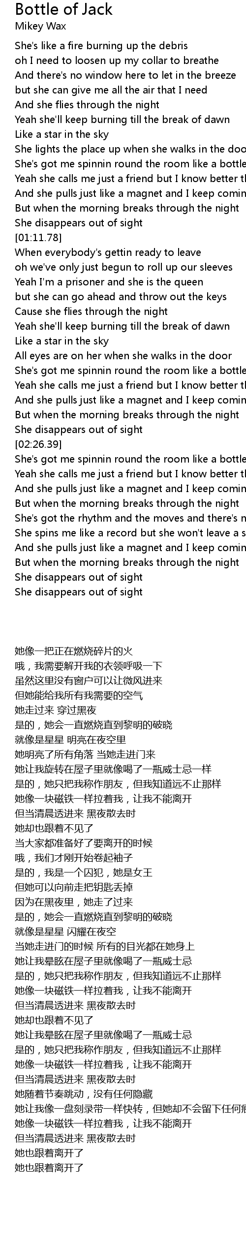 | [02:28.39] | She's got me spinnin round the room like a bottle of jack |
