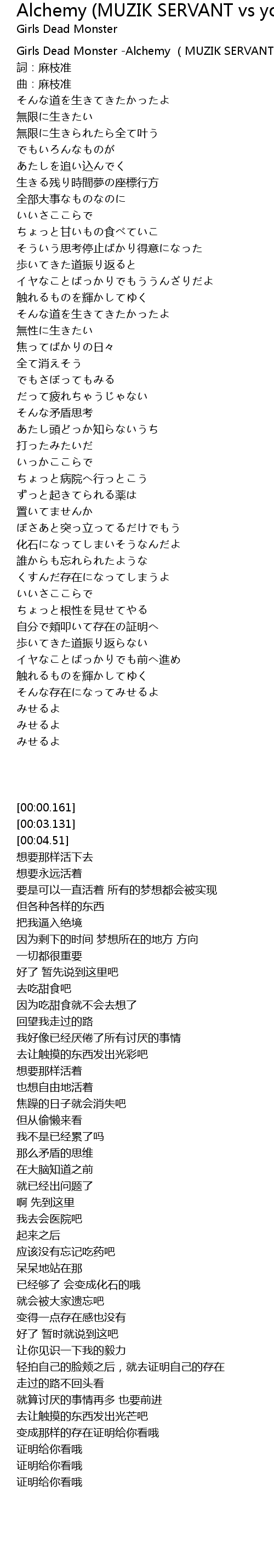 | [00:00.161] | Girls Dead Monster Alchemy MUZIK SERVANT vs you Remix |