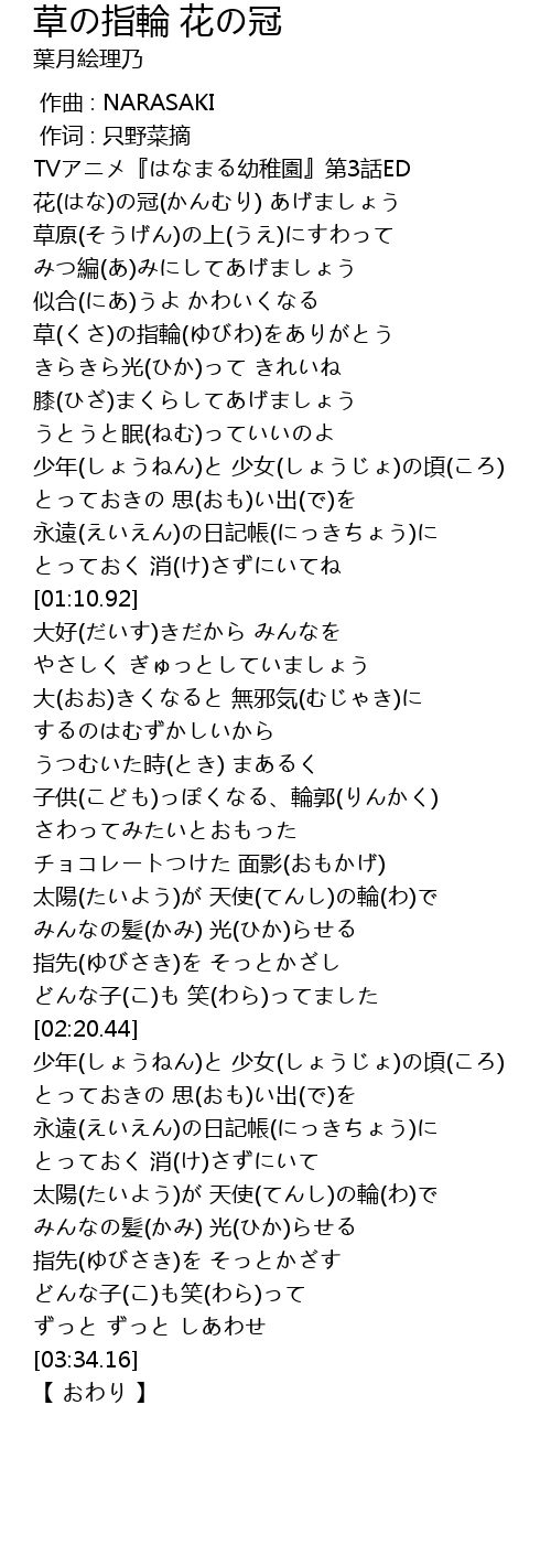 | [00:10.20] | 花(はな)の冠(かんむり) あげましょう |