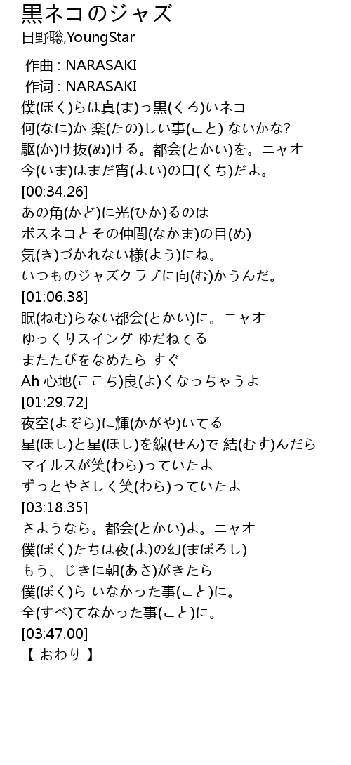 | [00:08.25] | 僕(ぼく)らは真(ま)っ黒(くろ)いネコ |