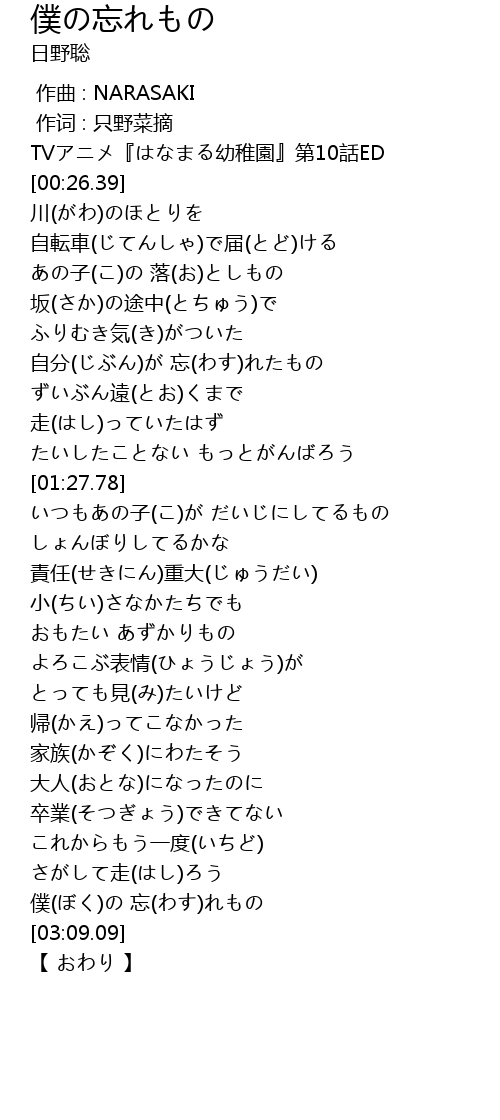 | [03:02.84] | 僕(ぼく)の 忘(わす)れもの |
