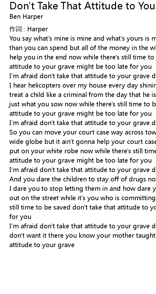 | I' m afraid don' t take that attitude to your grave don' t you take it there they don' t want it there you know your mother taught you better don' t take that attitude to your grave |