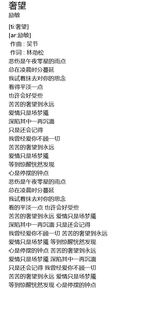 | [03:01.938] | 苦苦的奢望到永远 爱情只是场梦魇 |