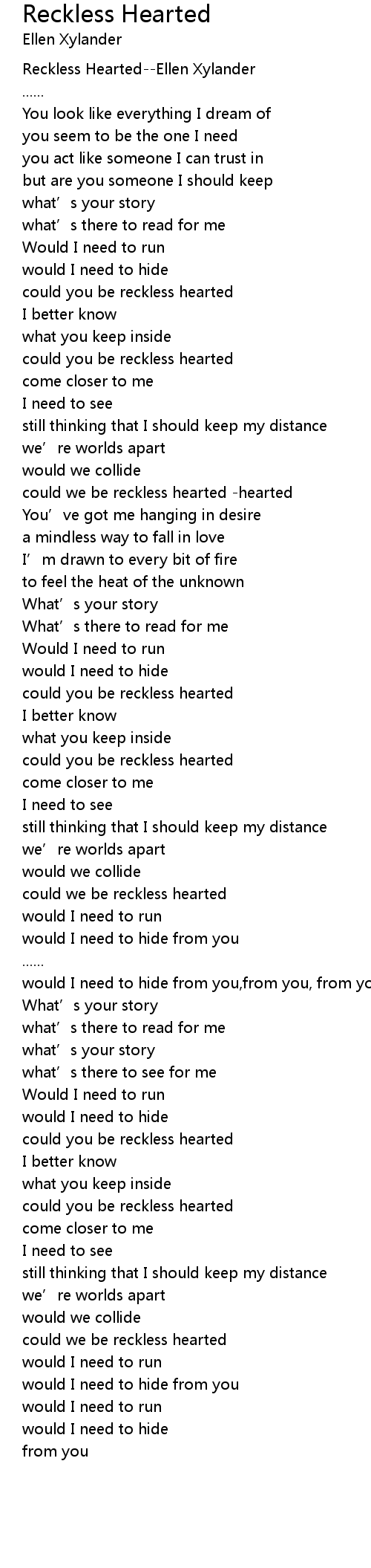 | [00:00.00] | Reckless Hearted--Ellen Xylander |