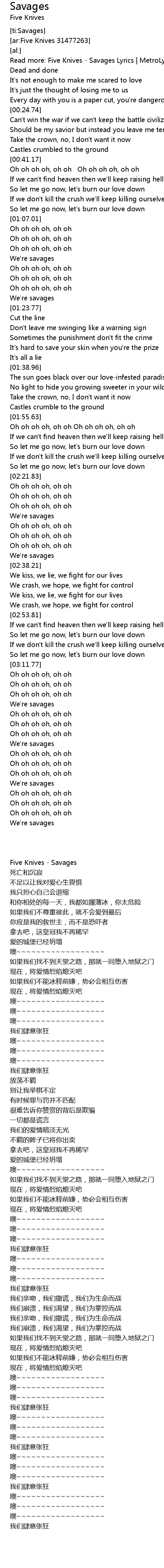 Read more: Five Knives - Savages Lyrics | MetroLyrics |