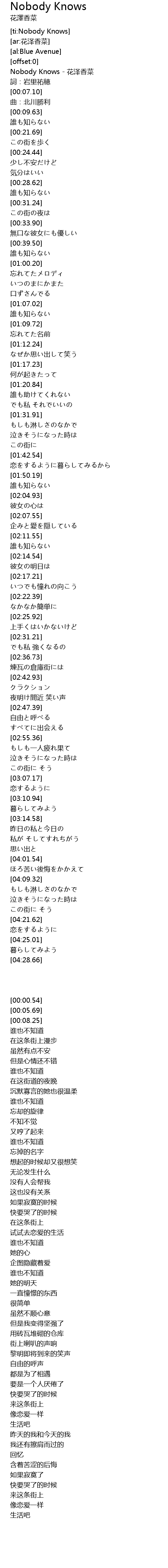 | [00:00.54] | Nobody Knows - 花泽香菜 |