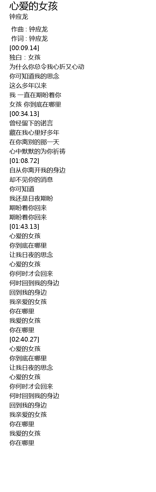 | [02:18.13] | wǒ qīn ài de nǚ hái |
