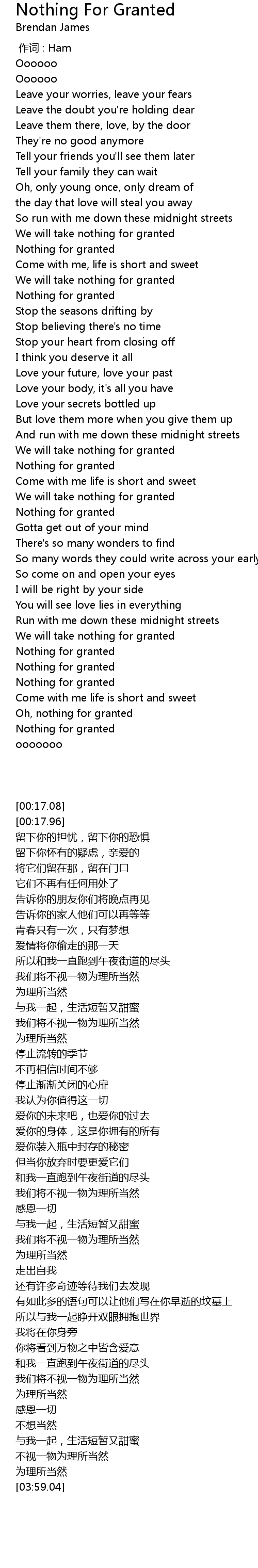 | [03:17.04] | Nothing for granted |