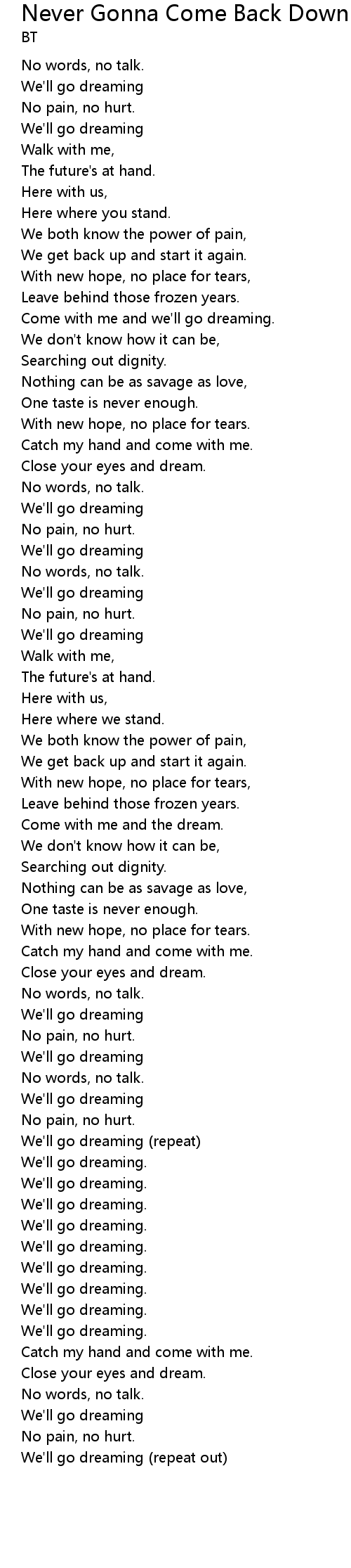 Song Never Gonna Come Back Down