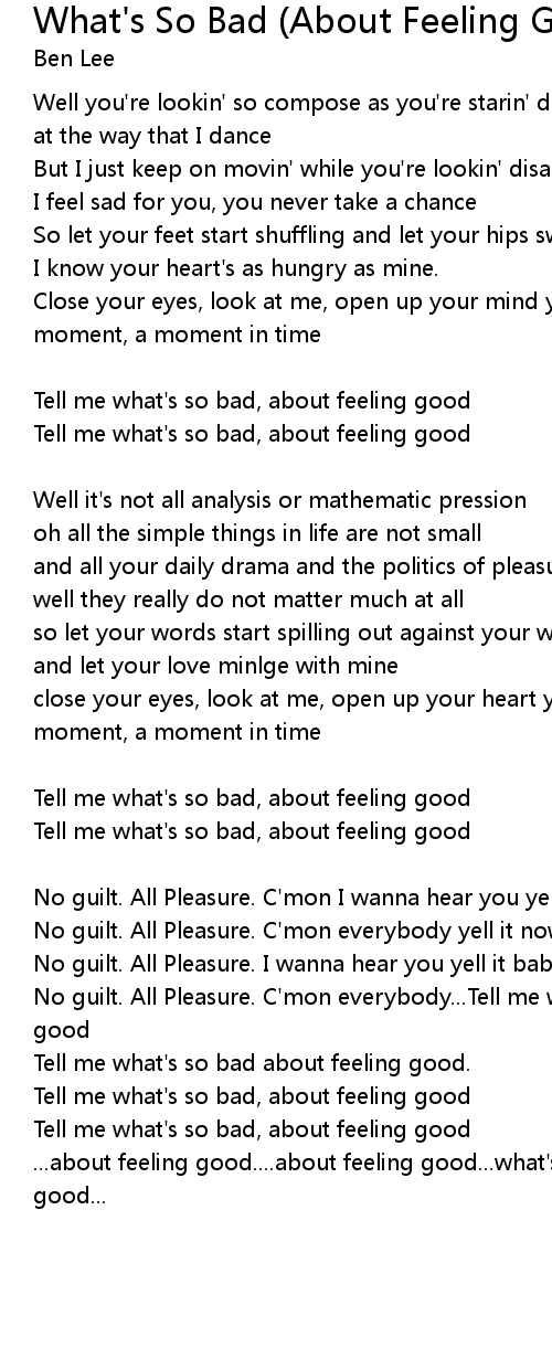 No guilt. All Pleasure. C'mon everybody...Tell me what's so bad, about feeling good |