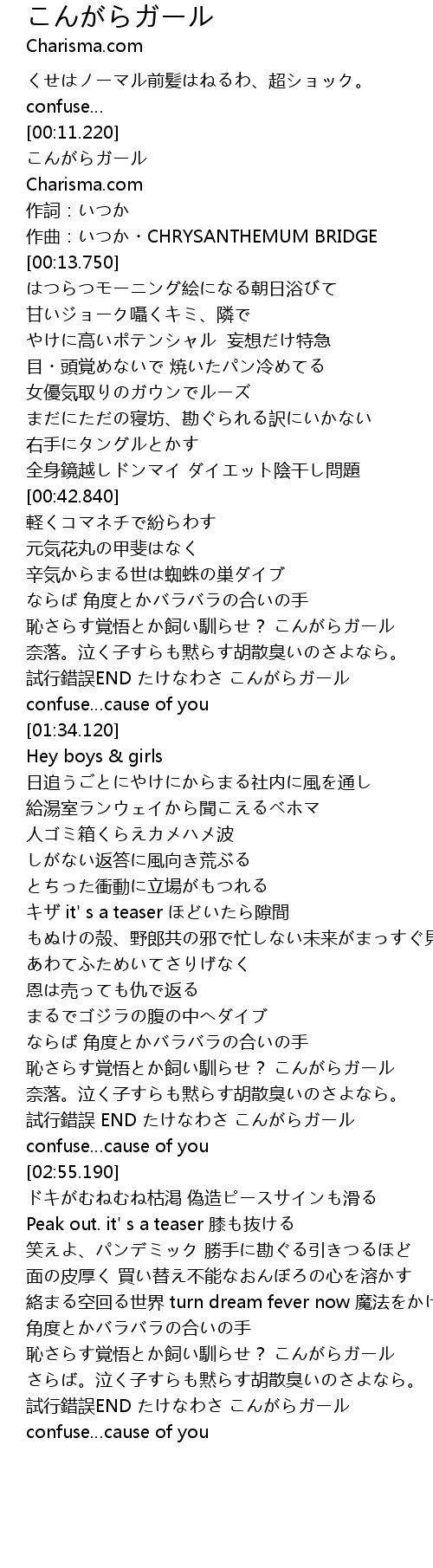 | [01:01.700] | 恥さらす覚悟とか飼い馴らせ? こんがらガール |