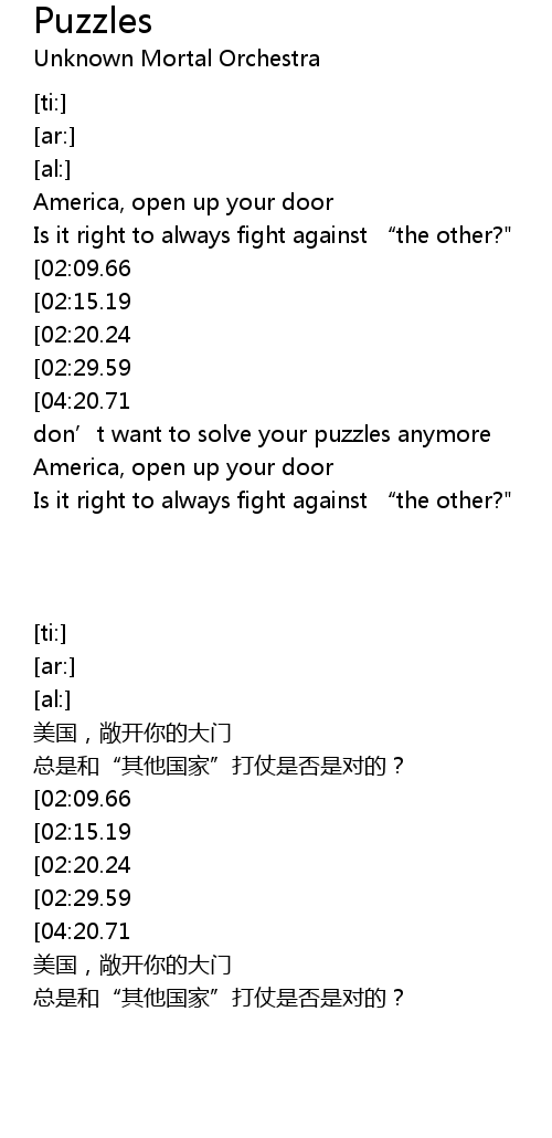 | [04:29.76][04:20.71][04:11.61][04:02.76][03:01.99][02:52.99][02:43.90][02:34.70] | I don' t want to solve your puzzles anymore |