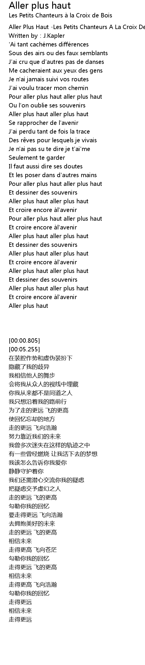 | [00:00.805] | Aller Plus Haut Les Petits Chanteurs A La Croix De Bois |