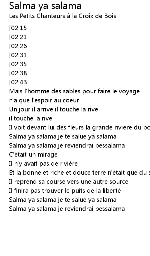 | [00:54][02:38] | Salma ya salama je te salue ya salama |