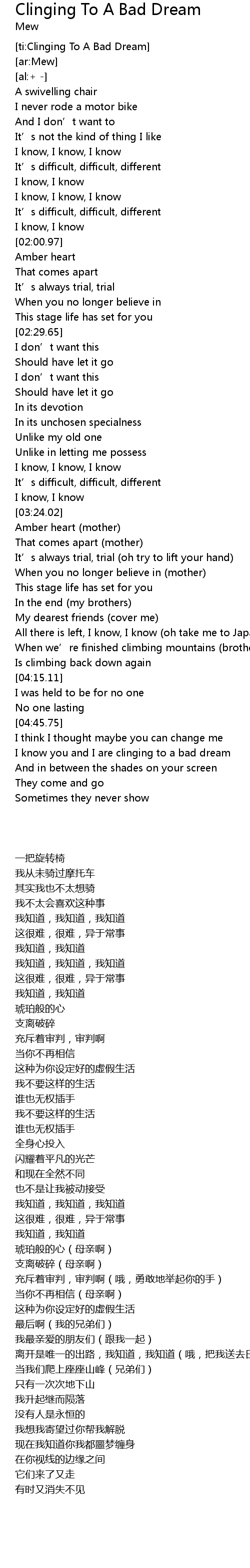 | [05:20.99] | I know you and I are clinging to a bad dream |