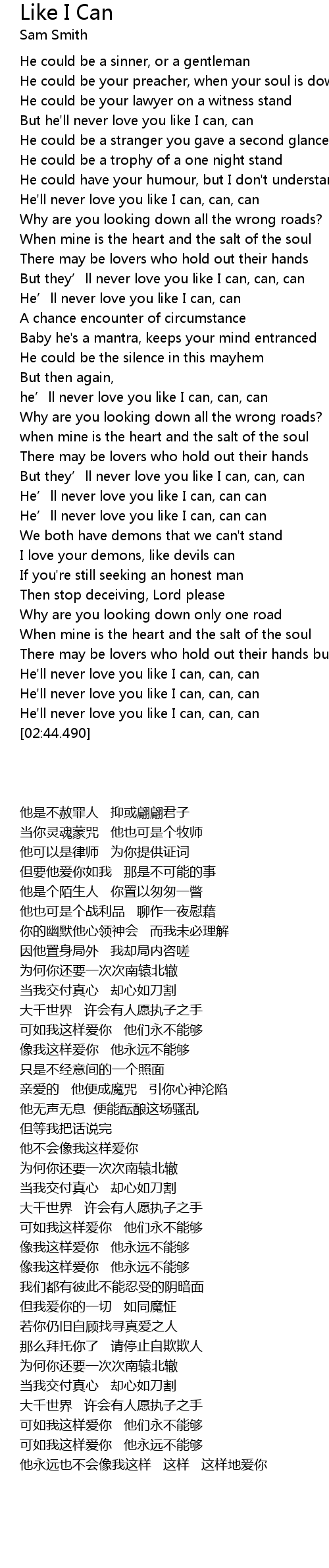 | [02:35.300] | He' ll never love you like I can, can, can |