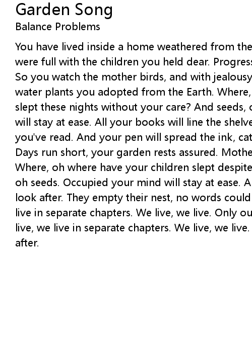 You have lived inside a home weathered from the years, and the rooms that once were full with the children you held dear. Progress came, stole your sons away. So you watch the mother birds, and with jealousy you stir. Lift your hands to water plants you adopted from the Earth. Where, oh where have your children slept these nights without your care? And seeds, oh seeds. Occupied your mind will stay at ease. All your books will line the shelves, proving every page you've read. And your pen will spread the ink, catalog the thoughts you've kept. Days run short, your garden rests assured. Mother's eyes are watching over dirt. Where, oh where have your children slept despite the cold night air? And seeds, oh seeds. Occupied your mind will stay at ease. Alone with the best, a root to look after. They empty their nest, no words could have mattered. We live, we live in separate chapters. We live, we live. Only ourselves to look after. We live, we live in separate chapters. We live, we live. Only ourselves to look after. |