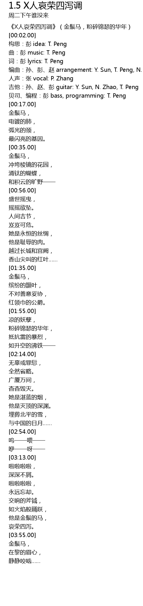 | [00:01.00] | 《X人哀荣四泻调》(金鬃马,粉碎锦瑟的华年) |